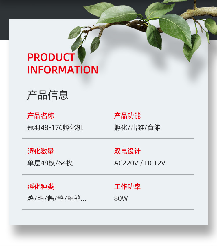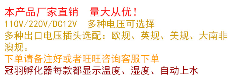 詳細(xì)信息 訂貨號詳詢 加工定制是 貨號詳詢 適用對象雞,鵝,鵪鶉,鴿 用途孵化設(shè)備 品牌冠羽 型號64枚 外型尺寸詳詢 包裝說明中性包裝 控溫范圍詳詢 類型孵化設(shè)備 產(chǎn)品類型全新 售后服務(wù)詳詢 是否跨境出口專供貨源否