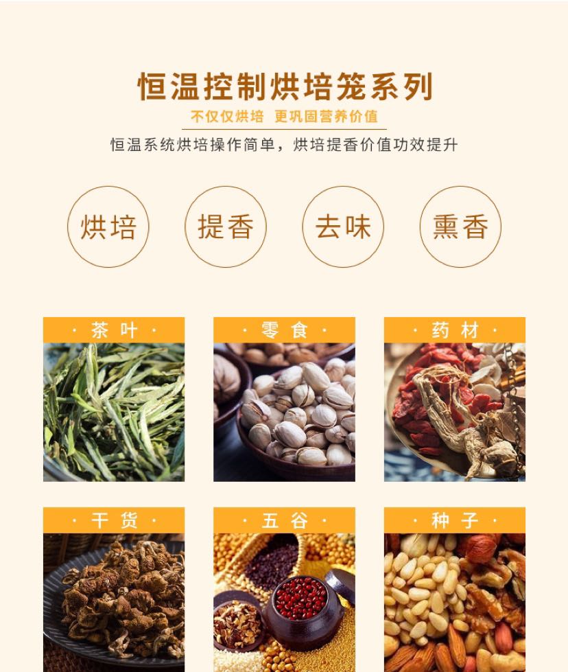 系統默認款式二篩子(鐵絲網篩)需要其他款式篩子,請聯系客服。13599233116 【多功能家用商用提香機】 茶店,茶樓,居家,酒樓好幫手--傳統無碳茶葉電焙籠,可烤綠茶,花茶,鐵觀音,紅茶,大紅袍等各種茶葉 【特點】 1.可降低茶葉含水量,但茶葉仍保侍清香口味,而不含烤火味. 2.烘過的茶葉不會變色. 3.提升茶葉香氣,色澤,口感. 4.延長茶葉保質時間. 5.機身體積小巧,不占空間,重量輕,移動方便,適合各種不同場所. 放在家中,酒店,茶樓,公司,店里等場所烘焙茶葉中,茶香四溢,能吸引顧客聞香上門;現焙現賣,延長茶葉保鮮時間,體現質量對顧客負責。多功能無炭茶葉電烘焙提香機竹編機體回歸傳統碳焙工藝。