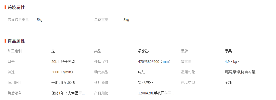 充電器:1只(12V);噴頭:3只;背帶:1付;膠管:1根;說明書:1份:伸縮桿1根:過濾網,皮墊。保修范圍: