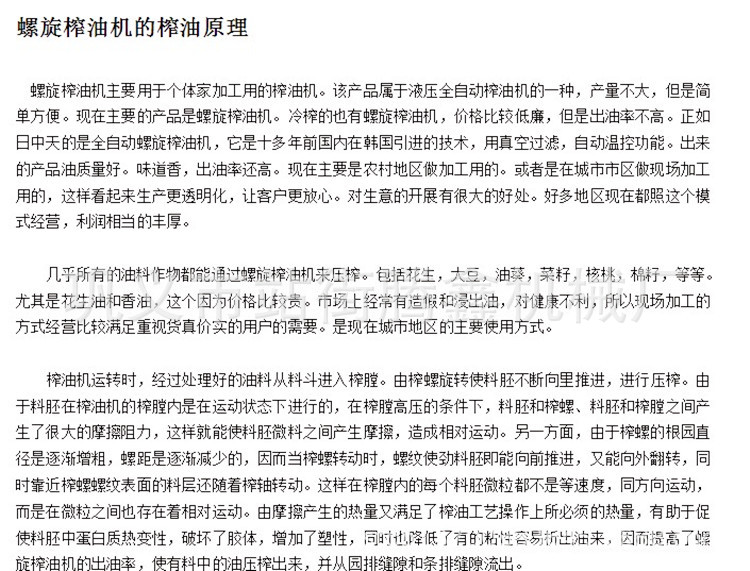 新型全自動多功能螺旋榨油機是引進國外先進技術,根據中國國情進行研制改進的新型榨油機設備,該榨油機占地面積小,生產效率高,具有選材考究、結構合理、外形美觀、質量可靠、操作簡便、省工省電等優點,更具備自動溫控、一次榨凈、出油率高、真空過濾、生產效率高等特殊優點。該多功能全自動螺旋榨油機更可一機多用,對芝麻、花生、菜籽、茶籽、大豆、油葵、胡麻、棉籽、玉米、核桃等20多種油料進行油品加工。四級壓榨出的油經過真空過濾,香濃誘人、晶瑩純正、安全衛生,可直接食用或瓶裝出售。