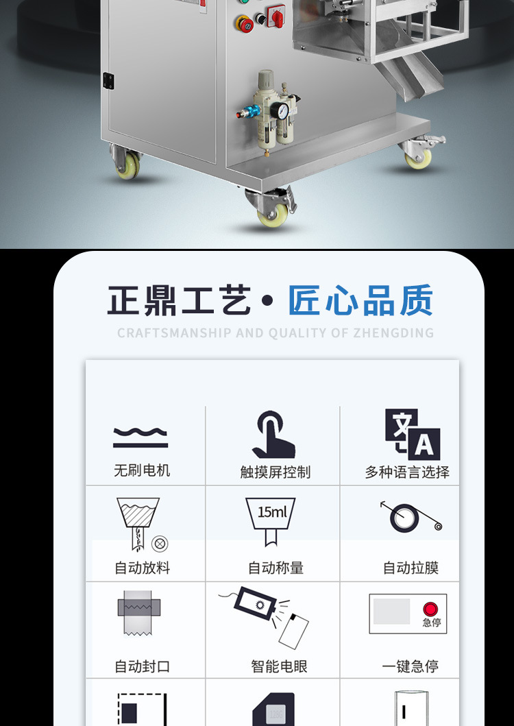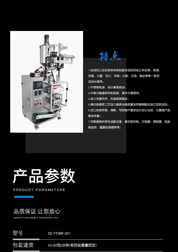 詳細(xì)信息 訂貨號(hào)ZD-220Y 加工定制是 貨號(hào)220Y 功能拆卸,打包,計(jì)量,封口,充填,包裝輔助,包裝容器成型,打碼、噴碼,條碼識(shí)別、打印 品牌正鼎 型號(hào)ZD-220Y 電壓220V/380V/50Hz/60Hz/1350W(V) 功率1.35(Kw) 包裝膜寬240(mm) 制成袋尺寸長(zhǎng)40-150mm,寬40-140mm(mm) 包裝速度20-60(袋/分鐘) 重量180(kg)