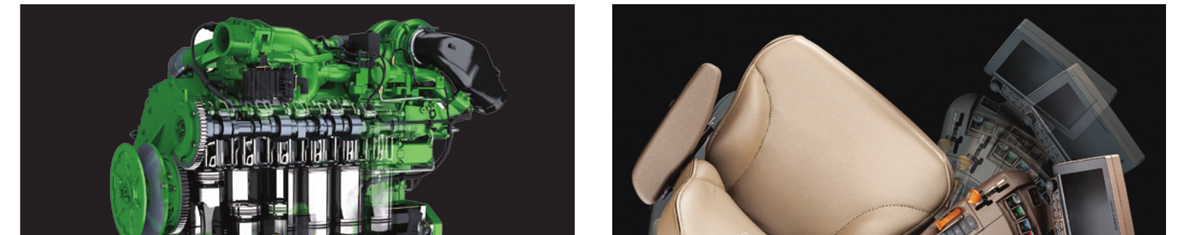 ● 生產效率高/可靠性高:新8R系列拖拉機采用PowerTech 9.0升6缸發動機,單缸4氣門,動力強勁,燃油效率高。目前提供290和320兩個馬力段的產品。支持發動機轉速巡航功能,可以實現完美的田間作業表現和道路運輸性能,輔以智能功率管理系統,有助于用戶實現最大盈利能力。全動力換擋變速箱,16個前進擋,4個倒擋,擋位切換平順,并且擋位切換沒有動力中斷,提供高效舒適的操控體驗。獨有的氣流控制和Vari-Cool冷卻系統,采用無級變速風扇,提供可靠高效的冷卻效果,降低燃油消耗。360度無死角LED燈光系統,讓夜間作業亮如白晝,還可通過編程實現燈光的私人訂制。