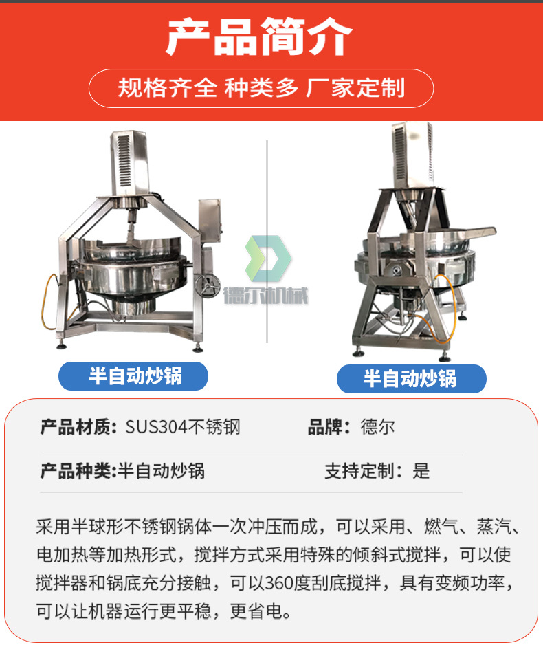 詳細信息 訂貨號DR-BZD300 加工定制是 貨號DR-BZD300 種類預煮機 品牌德爾 型號DR-BZD300 功率1.5(kw) 電壓380(V) 外形尺寸1500*1500*1900(mm) 產品用途物料攪拌炒制 凈重500(kg) 包裝纏繞膜 立式行星攪拌炒鍋 火鍋底料炒料機 半自動炒鍋中央廚房炒菜機 您剛好需要,我們正好專業 合作只是開始,服務永無止境