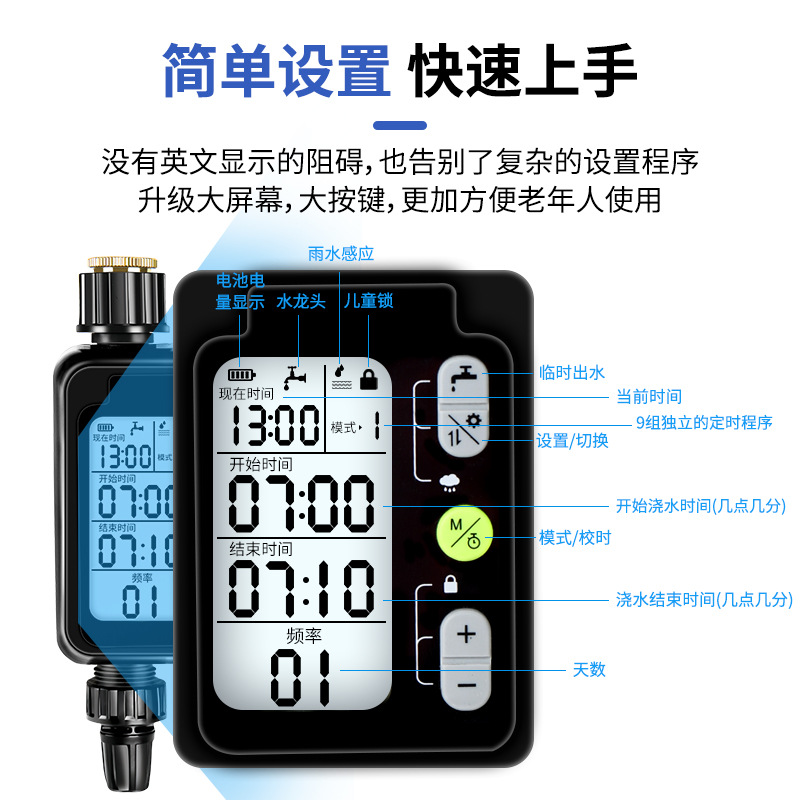 中文大屏定時澆花澆水器智能控制器灌溉噴頭滴灌噴淋系統雨感控制