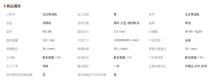6YL型螺旋榨油機是新改進的榨油機產品,是目前油料加工機械中的機器.它具有結構簡單,使用方便,適用性墻,出油率高,節電,噪音低等特點,對各種油料如花生、大豆、菜籽、棉籽、橄欖、向日葵、椰子、可可豆、草籽等植物油料均可進行壓榨,適用于中、小型油料加工廠及個體專業戶使用.也可用于浸出油廠的預榨.