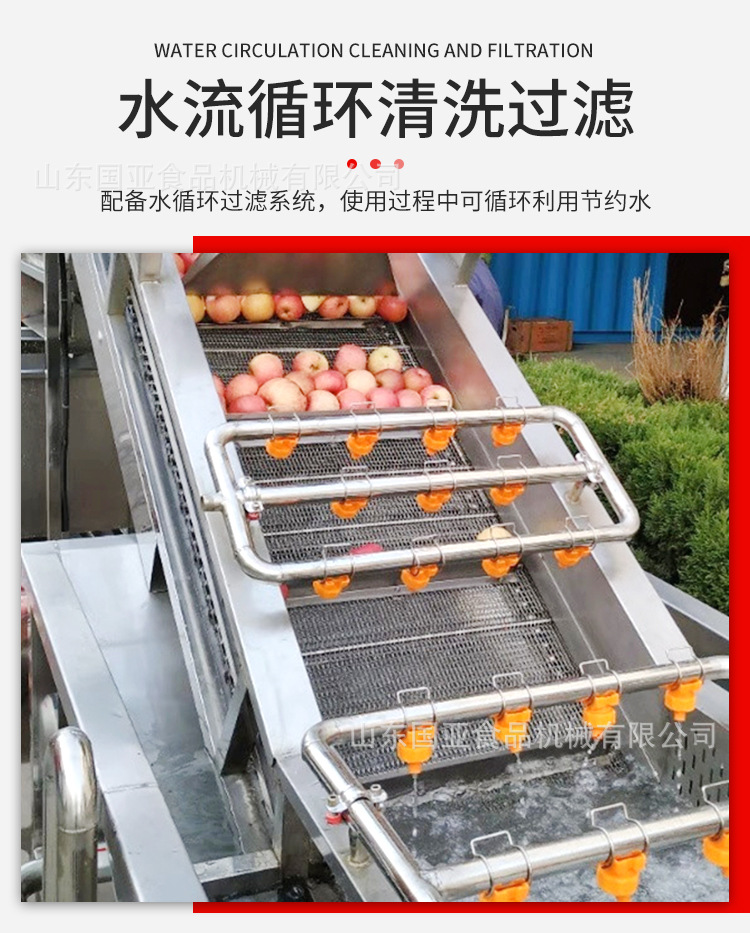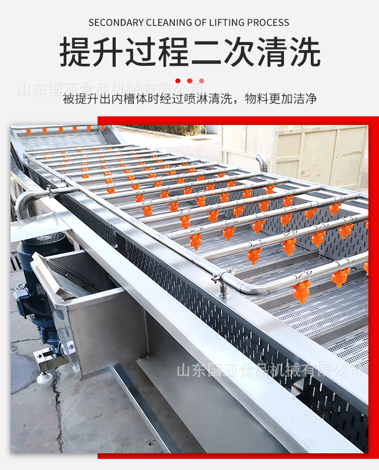 氣泡沖擊波原理能夠將蔬菜瓜果表面沖洗干凈,提高50%以上的工作效率,有效的殺滅有害細菌,分解殘留農藥;本機設有隔菜板,將清洗物與洗下的泥沙有效隔離開,降低了水的渾濁度,大幅提高了清洗水循環利用率,可節約80%的清洗用水,節省了人力;操作方便,省時省力,能耗低,衛生、、效率高。