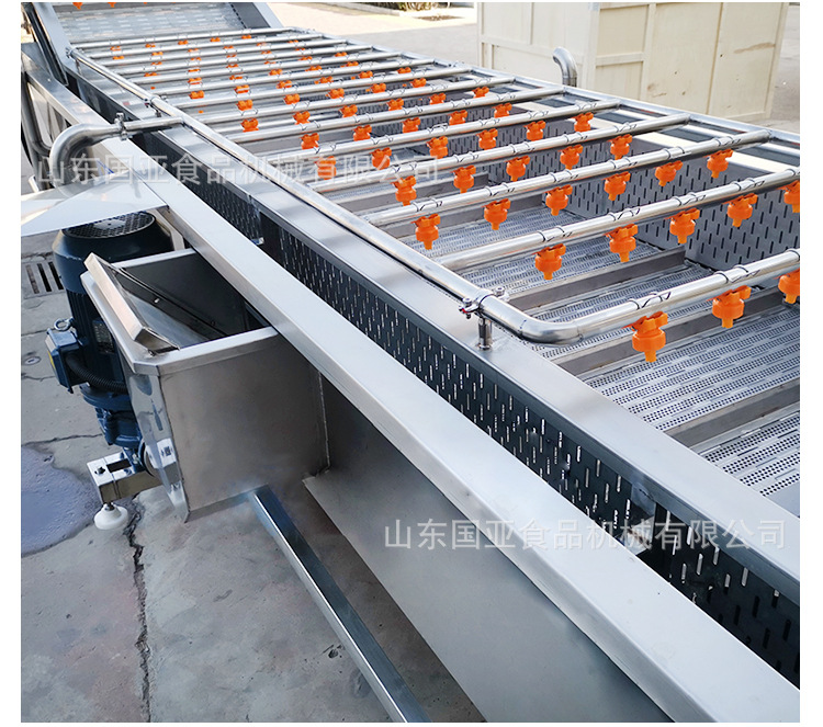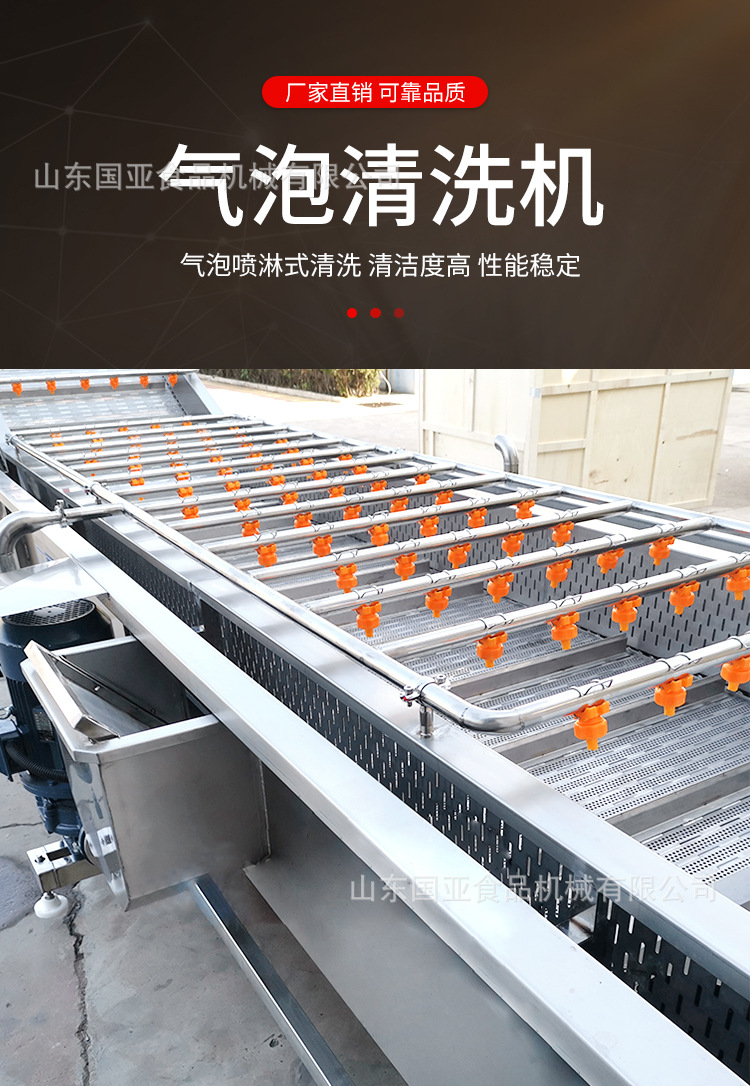 產品采用不銹鋼制造而成、堅固耐用、設備原料不會受損傷,從而達到洗潔凈高、節省勞力、節水、設備 性穩定,可靠等效果,裕豐牌氣泡清洗機、集自動連續清洗。被清洗物潔凈高出人工常規洗法三倍以上。 本機采用高壓水流和氣泡發生裝置沖擊被清洗物體表面,氣泡在與物體接觸時破裂產生的能量,會對被清洗物體表面起到一個沖擊和刷洗的作用,刷洗被清洗物體表面,將被清洗物體清洗干凈。