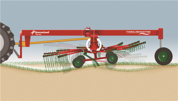 采用4輪支撐地盤,地面仿形能力強,摟草效果好,采用快速提升裝置,最大離地間隙50厘米
