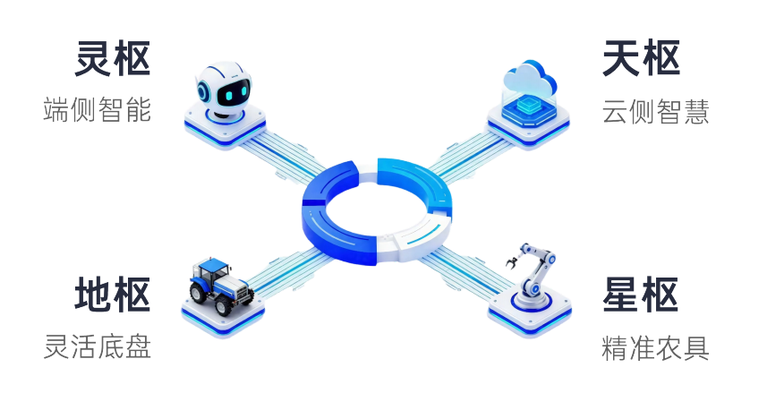 棉花智能打頂機器人VTM-09B是搭載「經緯」全棧式智能農業機器人平臺的產品,代表未來農機形態。由四個技術架構組成,分別為地樞(靈活底盤)、靈樞(端側智能)、星樞(精準農具)、天樞(云側智慧)。
