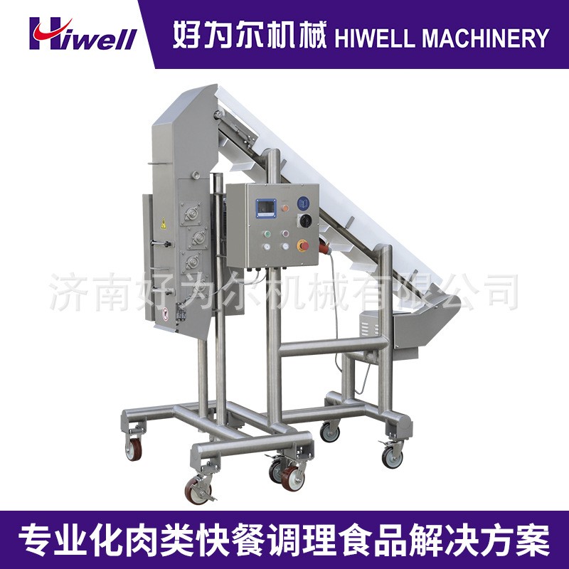 通過4組轉(zhuǎn)輥的轉(zhuǎn)動,將熟制的雞肉、豬肉、牛肉粉碎成像手撕效果的纖維